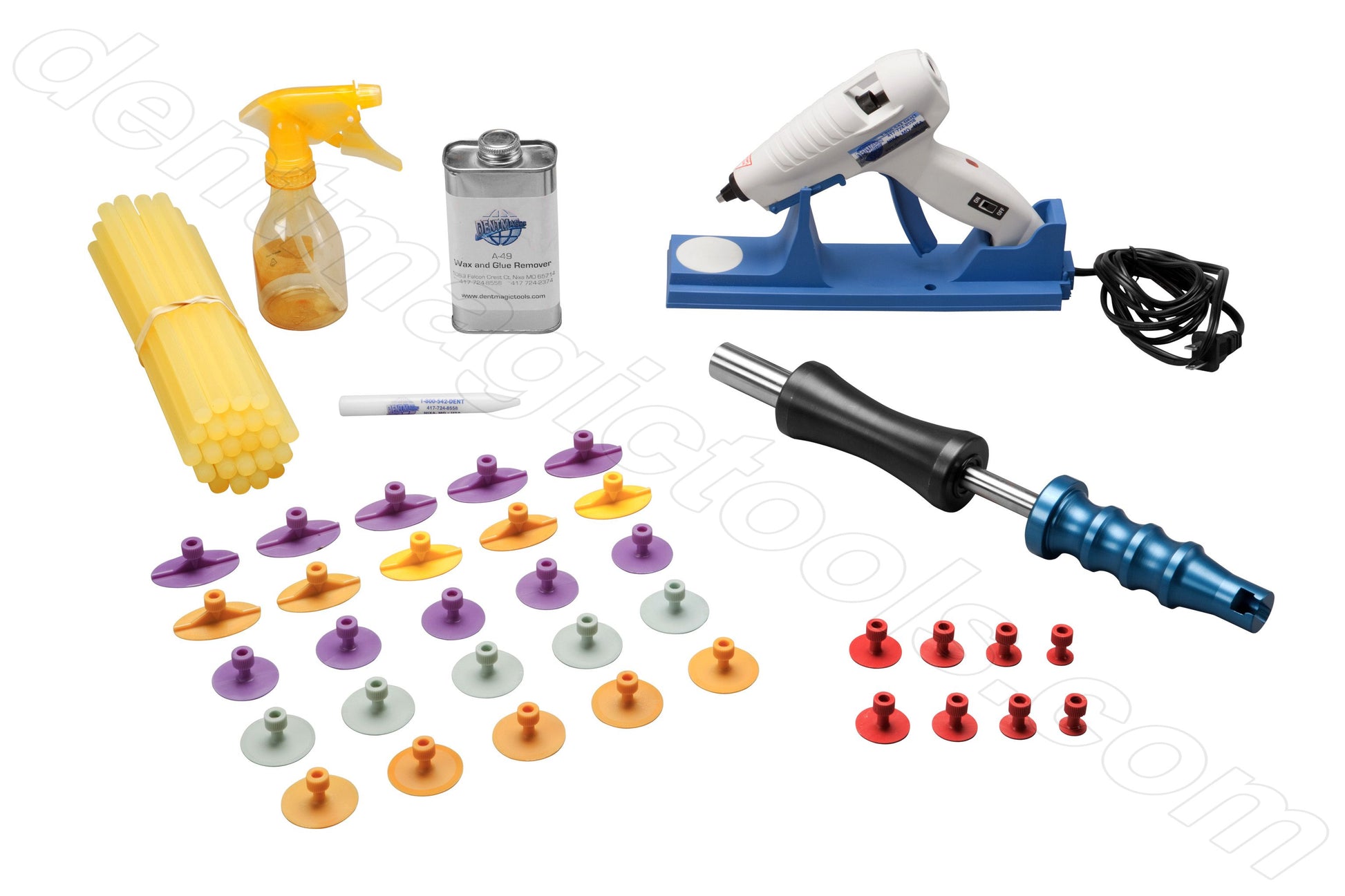 A-87 Slide Hammer A-54 CCG Cordless Glue Gun Glue Gun A-42 24 Glue Sticks High Bond Yellow A-49 glue and wax remover A-110 spray bottle T-B Nylon tap down-pointed 33-multi sized/color glue tabs Includes: Used for Hail repair and deep dents. 2 A-43-20 20mm round/red 2 A-43-32 32mm round/red 2 A-44-16 16mm round/red 2 A-44-25 25mm round/red Used for larger dents. 5 A-45 40mm round-thick/yellow 5 A-55 50x30mm oval-thick/yellow 5 A-56 40mm round-thin/blue 5 A-57 35mm round-thin/purple 5 A-58 50x30mm-thick/purple