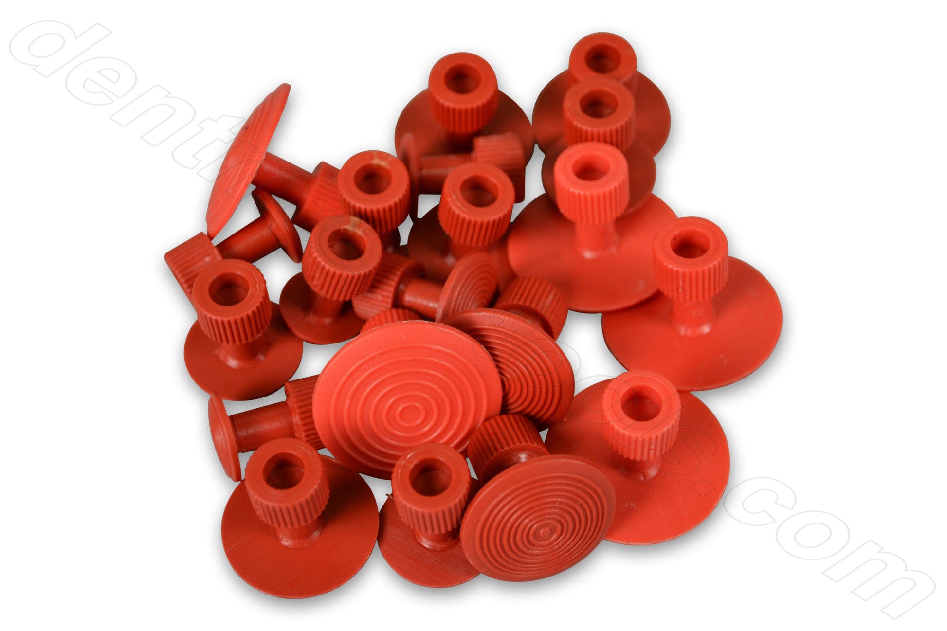 This is a 20 piece combo set of PDR glue tabs. It includes five of each of the four different sizes of tabs. The tabs are round with 16 mm, 20 mm, 25 mm, and 32 mm diameters. These tabs fit all standard glue tab pulling systems. They work great for small door dings and hail damage.