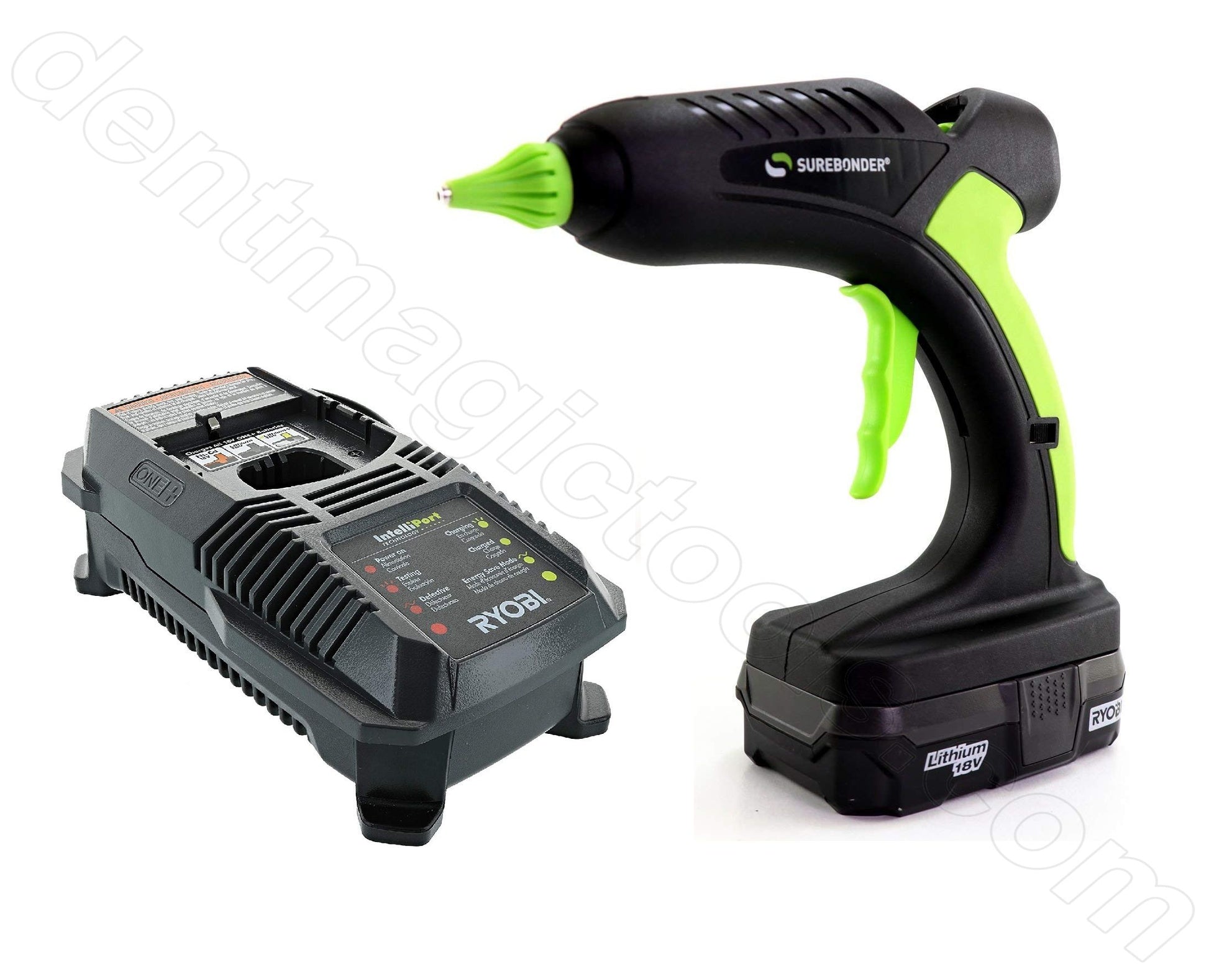 Introducing our new Pro2-60 Cordless Industrial Glue Gun! Our new cordless high temperature glue gun is powered by a high performance Ryobi 18-Volt Lithium-Ion compact battery that provides user efficiency and versatility to go anywhere. Pro2-60 uses a PTC heating system that gives you consistent working temperature and longer run time. Features: Allows up to 1 hr cordless time, ergonomic easy squeeze trigger, on/off power light, comfort grip handle, interchangeable insulated nozzle. Ideal for Paintless Dent Repair while using the PDR Glue Pulling Process! Uses 7/16", 1/2", .43" standard glue sticks. Use with HG-3 P128 Battery/Charger Kit. Includes Glue Gun, Battery and Charger.